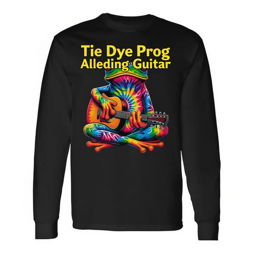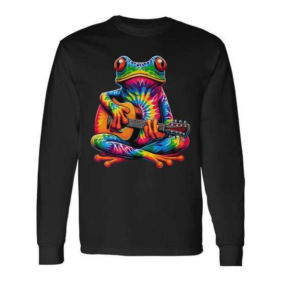 T-shirt a maniche lunghe con motivo tie-dye rana che suona la chitarra, design hippie con simbolo della pace