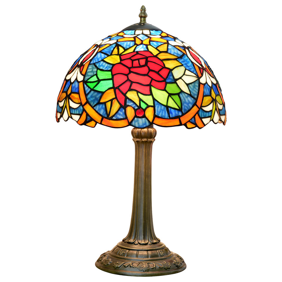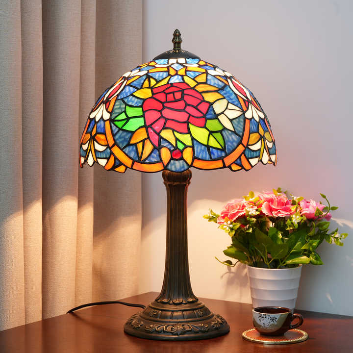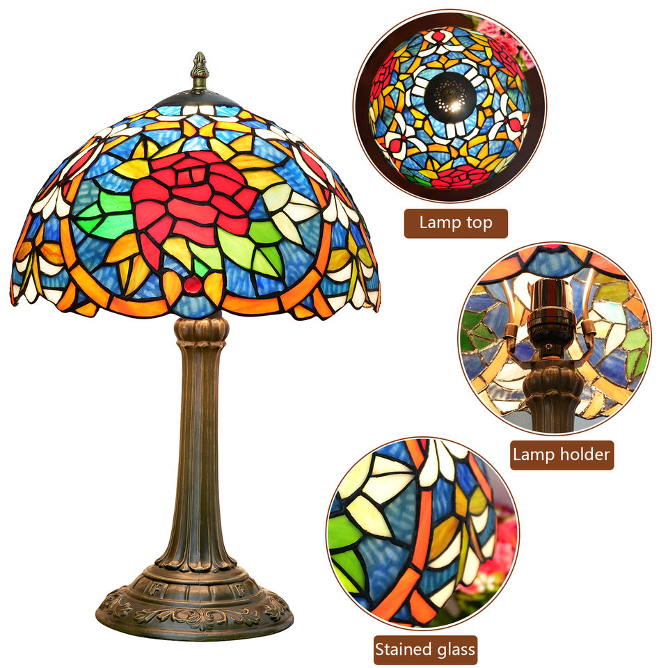 Lampada da Tavolo Stile Tiffany, Lampada da Comodino in Vetro Colorato, Luce da Lettura con Rosa Rossa, Decorazione per Camera da Letto, Soggiorno, Ufficio
