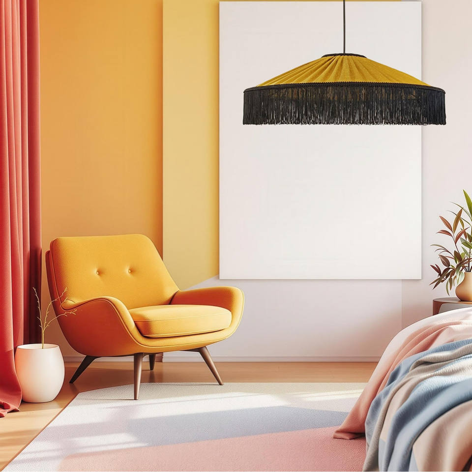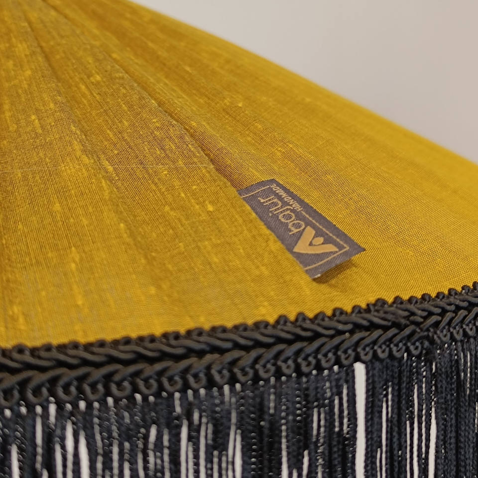 Tiffany gold olive soie sauvage Shantung, black fringed, handmade pendant light.