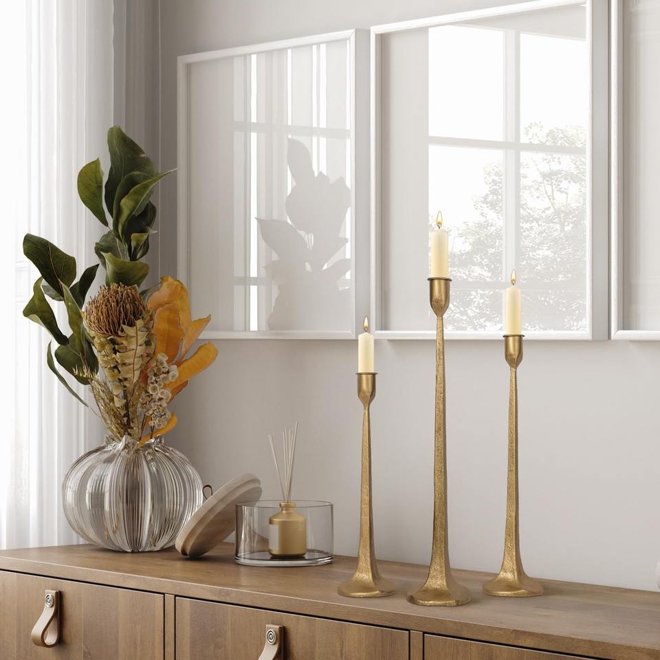 Portacandele dal finitura metallica intramontabile, aggiunge un tocco sofisticato senza sovraccaricare il decoro circostante.