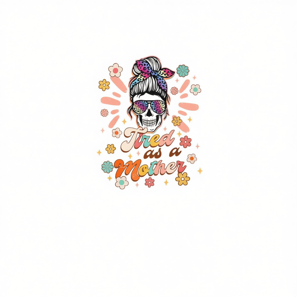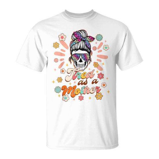 T-shirt con design Tired As A Mother Skull, girocollo da donna, manica corta, stampa digitale