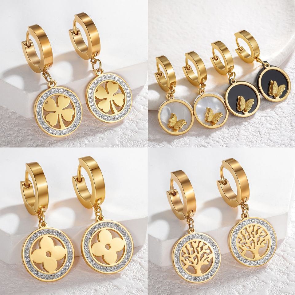 QAUNYI Orecchini pendenti Quadrifoglio in acciaio titanio da donna vintage, leggeri, placcati argento/oro/gun nero