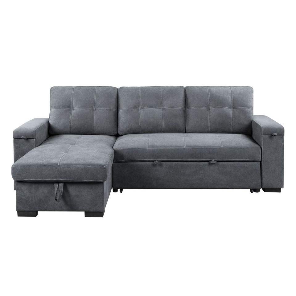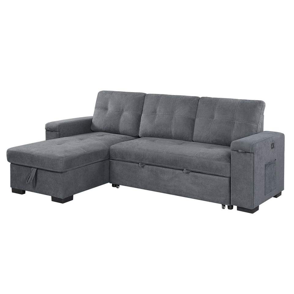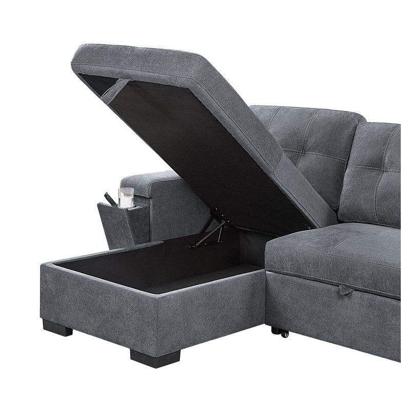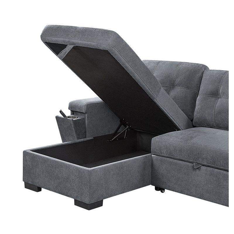 Divano Sezionale Reversibile Toby 95 con Chaise Longue Contenitore, Tessuto Grigio Intrecciato, Portabicchieri, Porte di Ricarica e Tasche - Divano Letto