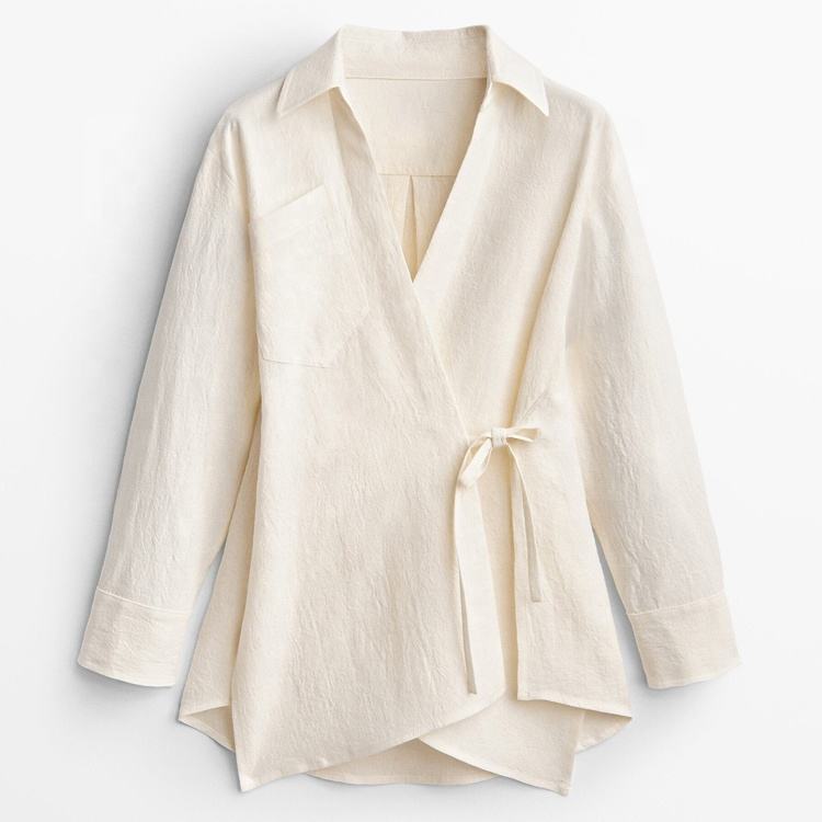Tong Rui in lino color avorio Kimono corto Crossover con collo a V e cravatta a papillon Top camicia di lino da donna