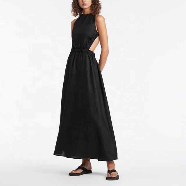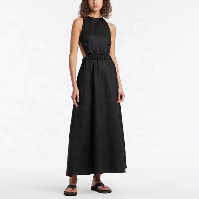 Tong Rui S22 Long Linen Backless Sexy Black Dress Women Elegant Black Dress Halter