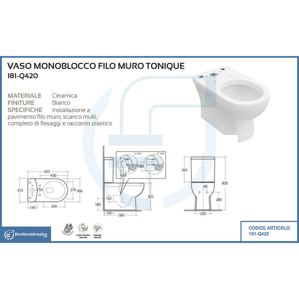 WC Monoblocco Tradizionale a Pavimento con Serbatoio Nascosto e Doppio Scarico per Vasca Allungata, Ideale per Ville
