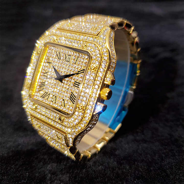 Top Luxury Fashion Full Diamond Watch for Men Bling Iced Out Quartz Wristwatch Square Dial Clock Hip Hop Water-resistant