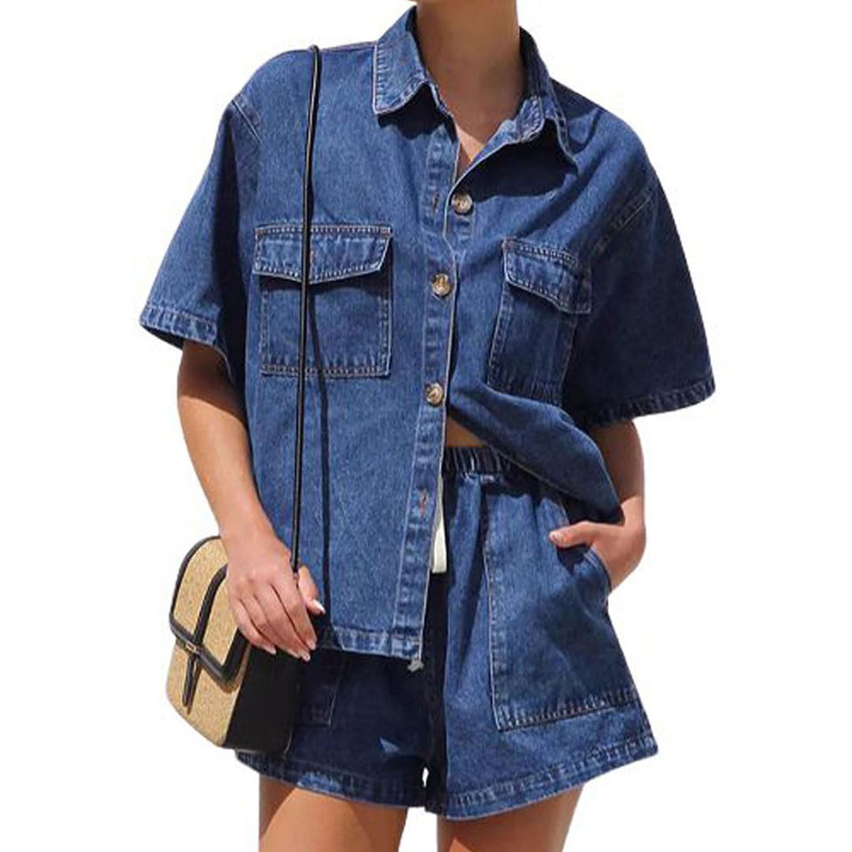 Set di Alta Qualità: Camicia in Denim a Due Pezzi con Chiusura a Bottoni e Spalle Scivolate, Pantaloncini con Cordoncino in Vita, Completo Jeans da Donna