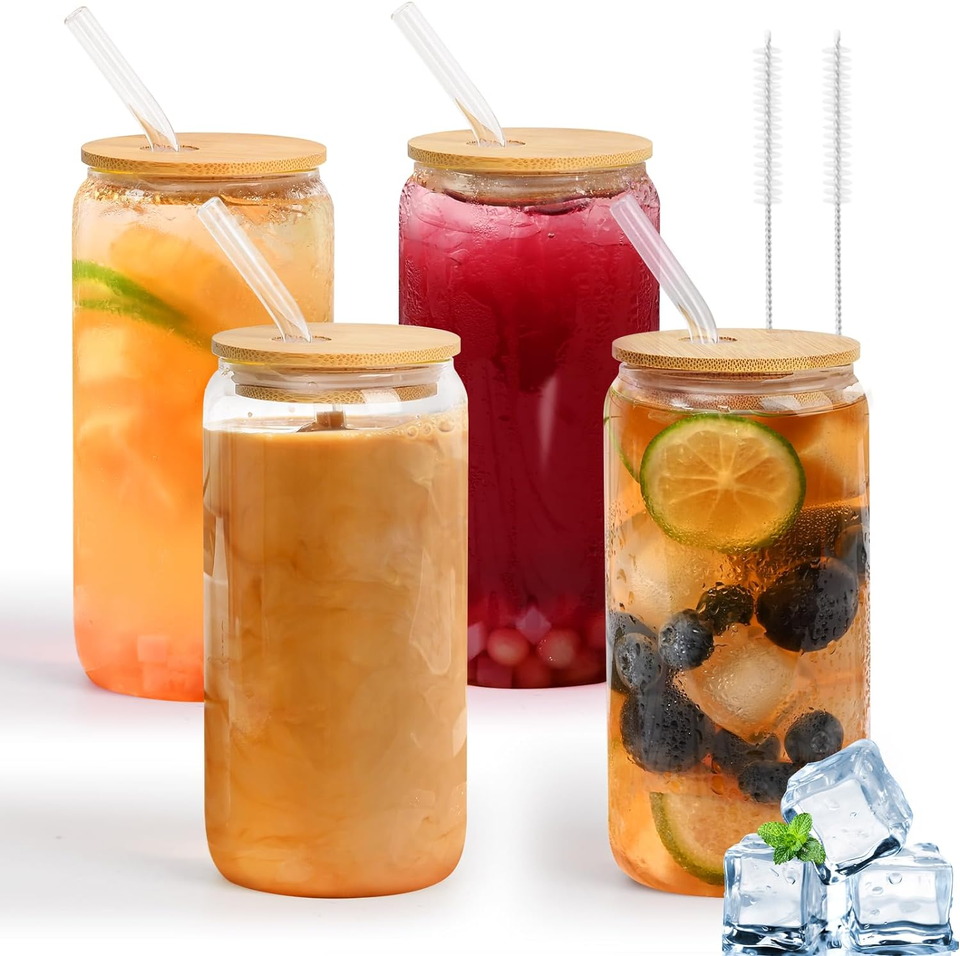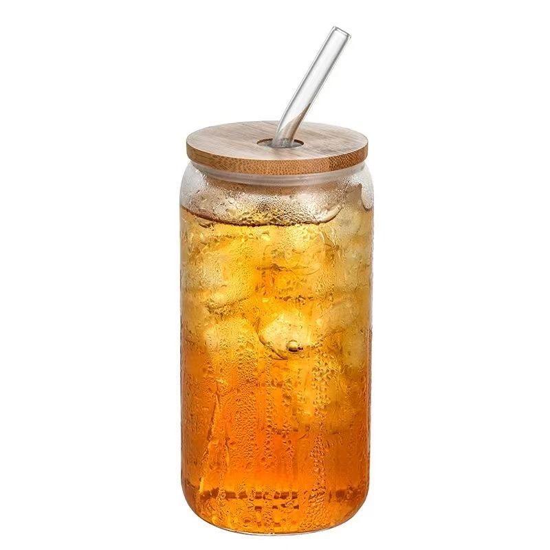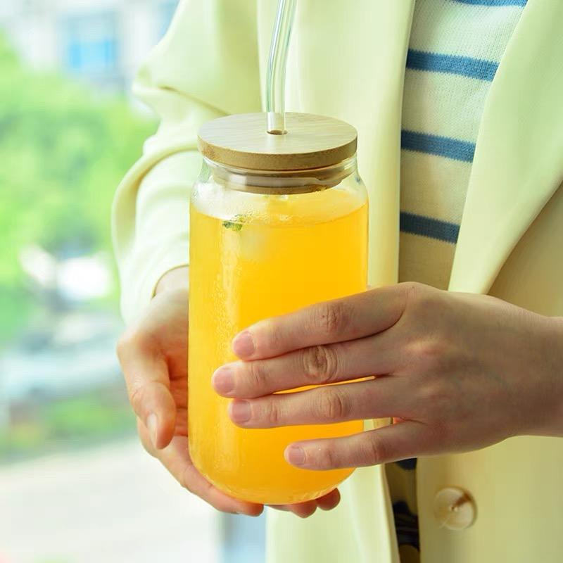Top Quality Drinking Glass With Bamboo Lids Glass Straw 16oz Can Shaped Cocktail Glass Cup Beer Iced Coffee Glasses