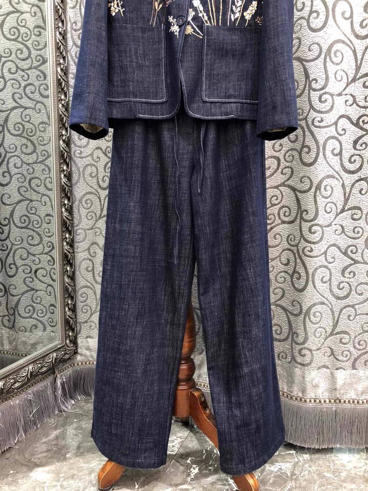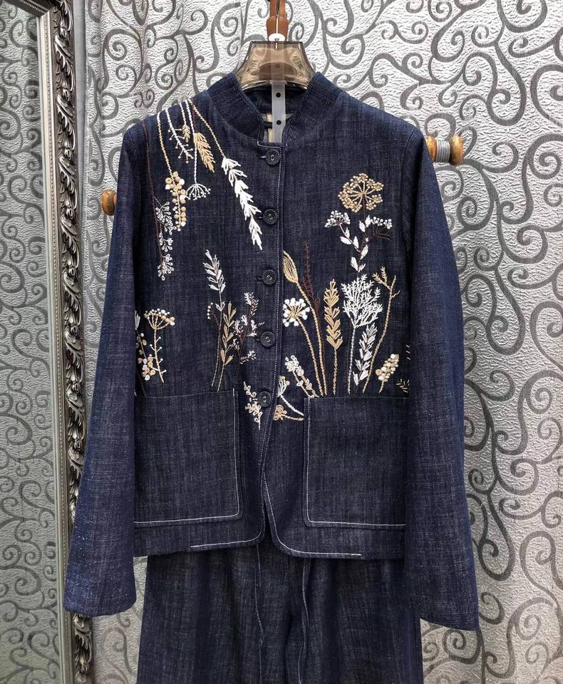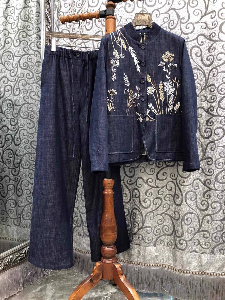 Top Quality New Designer Fashion Pant Suits 2025 Autumn Winter Women Luxurious Embroidery Denim Coats+Cotton Linen Pant Sets 2pc