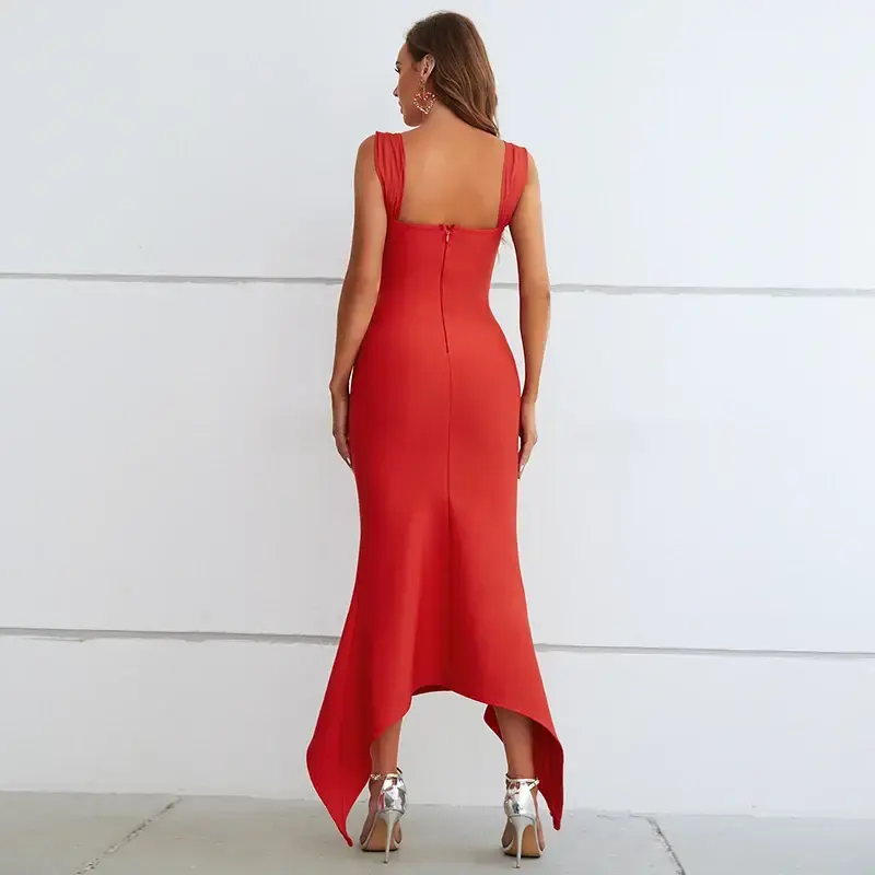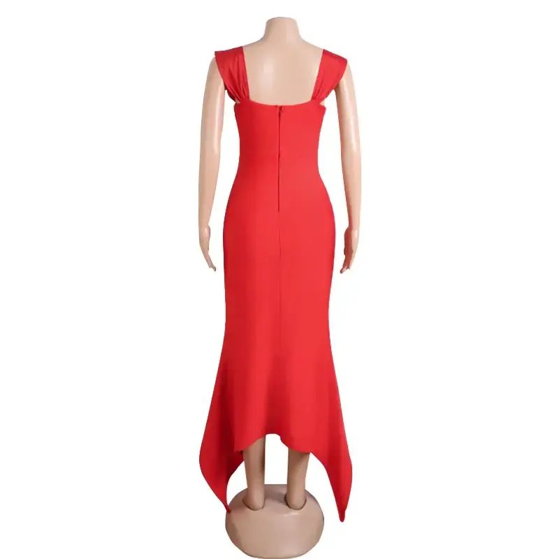 Abito lungo elegante rosso in raso, modello bodycon, con scollo sulla schiena, plissettato, vita naturale, ecologico, il più venduto