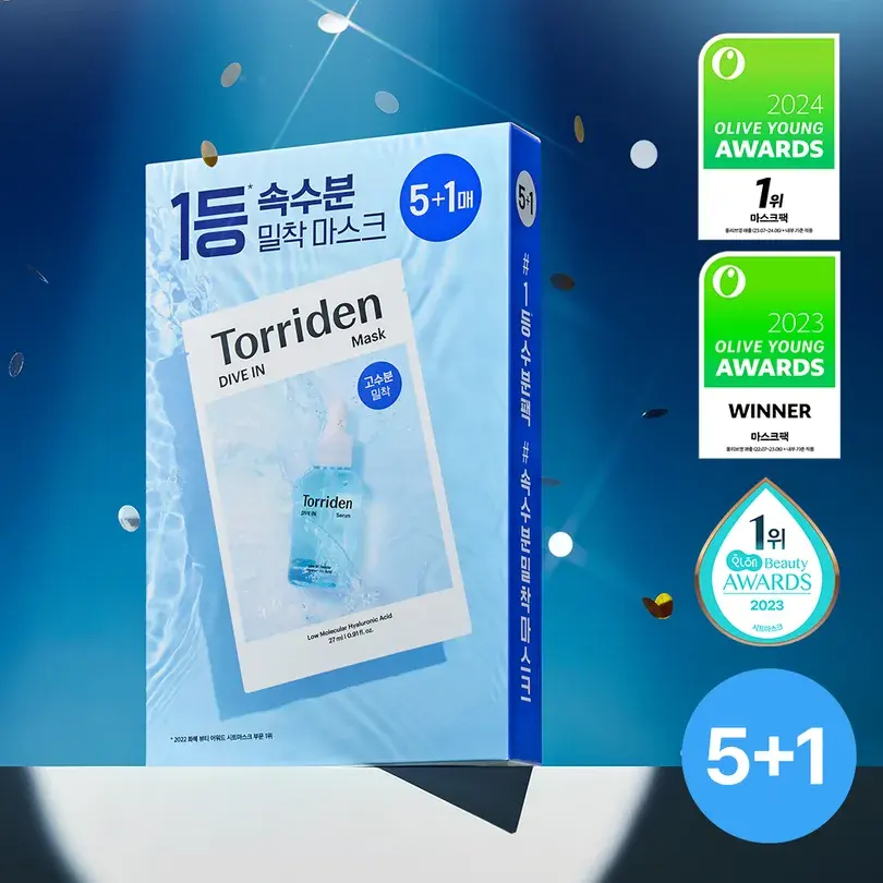 Torriden Low Molecular Hyaluronic Acid Dive-In Mask Sheet 5+1ea for Optimal Facial Hydration & Glow