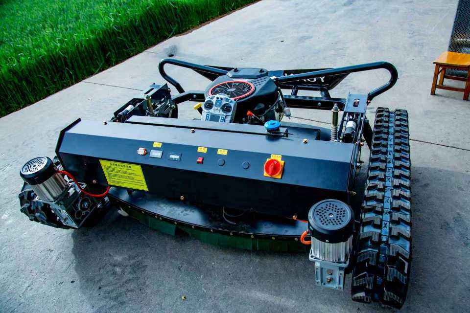 Tagliaerba telecomandato cingolato, con funzione di triturazione e ritorno sul campo, attrezzo agricolo per la rimozione delle erbacce