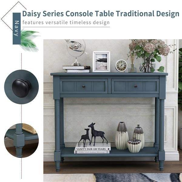 Traditional Design Console Table with Two Drawers and Bottom Shelf in Navy Color