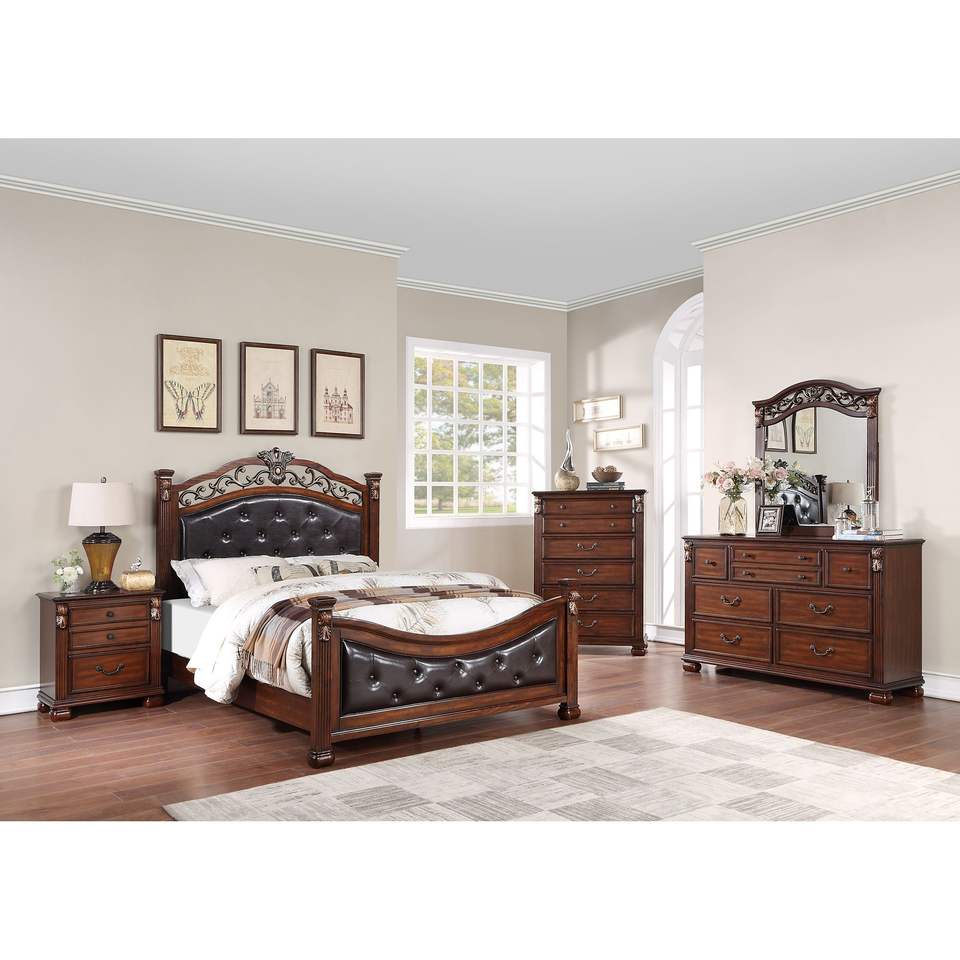 Letto matrimoniale king size tradizionale orientale con testiera e pediera trapuntate in similpelle, letto imbottito formale in ciliegio scuro
