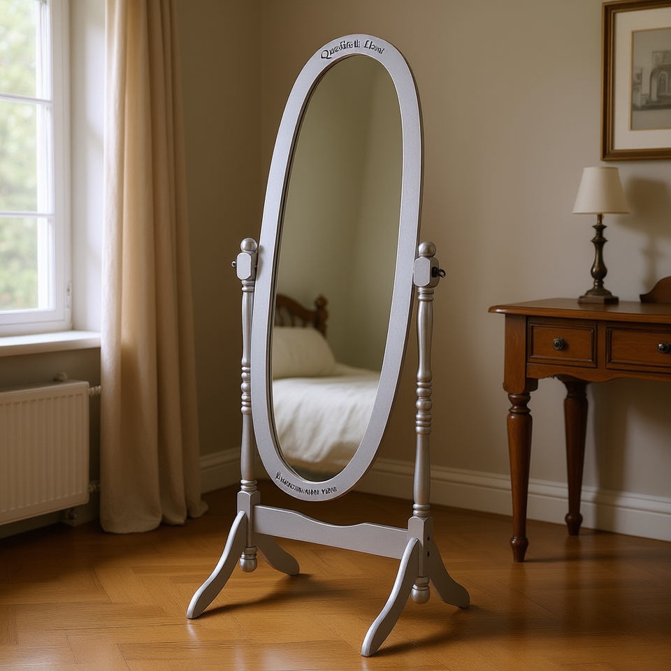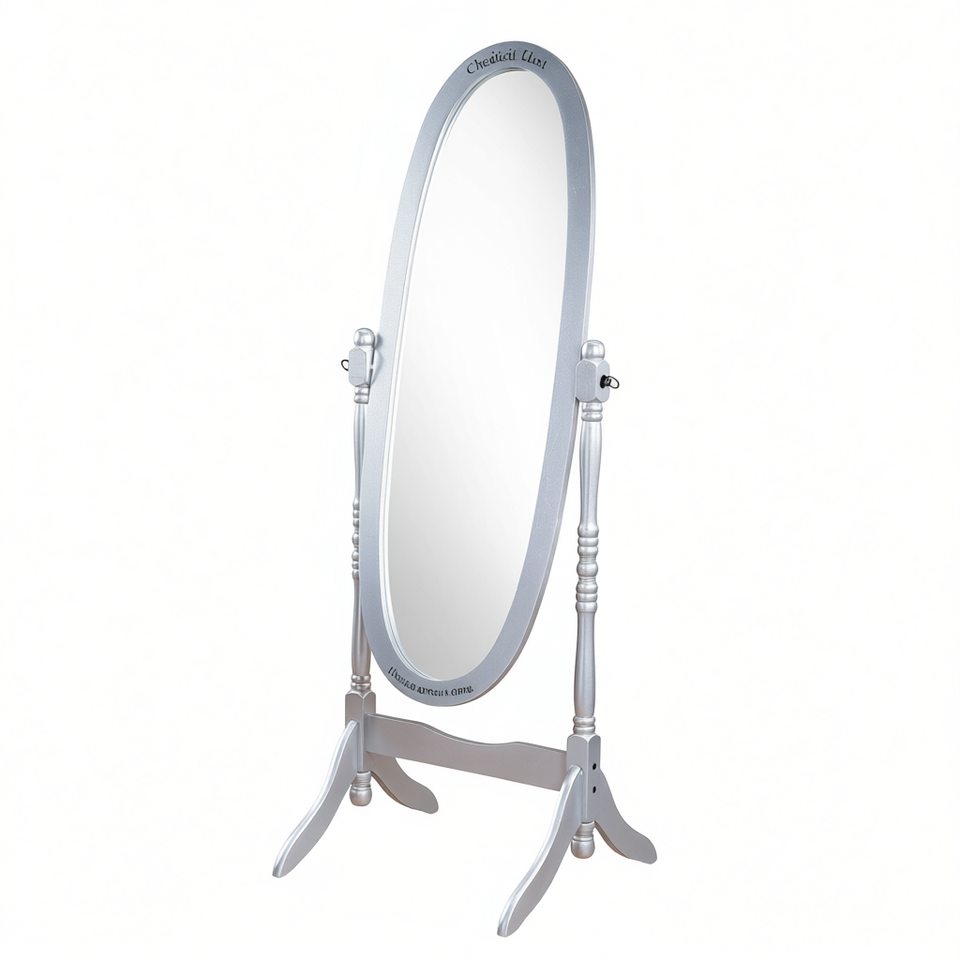 Specchio da terra in stile Queen Anne con finitura argento e supporto regolabile