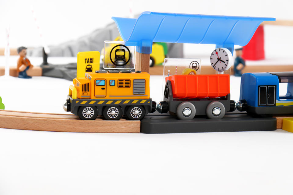 Treno Set educativo assemblato per bambini giocattolo stile stazione ferroviaria con locomotiva elettrica modello ferroviario giocattolo Slot in legno di alta qualità