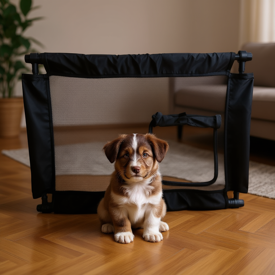 Travel Portable Pet Gate Collapsible Folding Cat Dog Pen Black Polyester Rectangle Hook Loop Closure