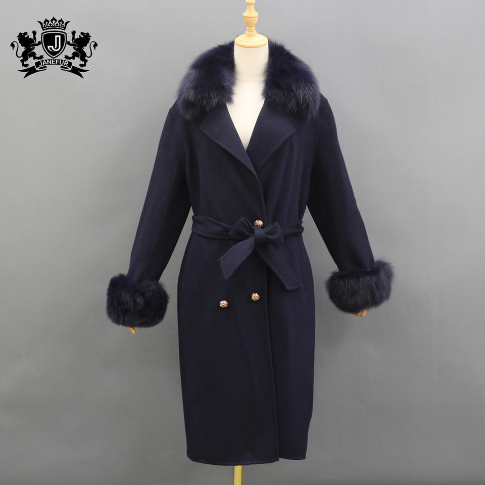 Trench Cashmere Coat Women Fox Fur Collar Wool Coat Handmade Cashmere Wool Coat for Women