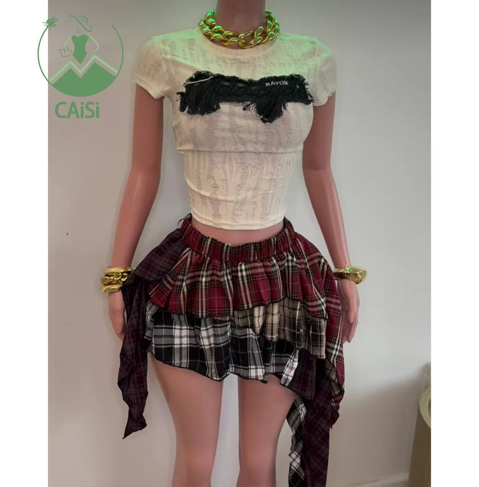 Set di gonna alla moda 2 pezzi Patchwork magliette a maniche corte e minigonna scozzese e set di gonne in due pezzi da donna abbinate