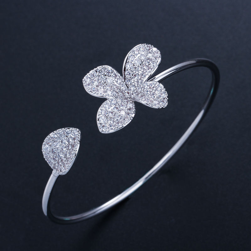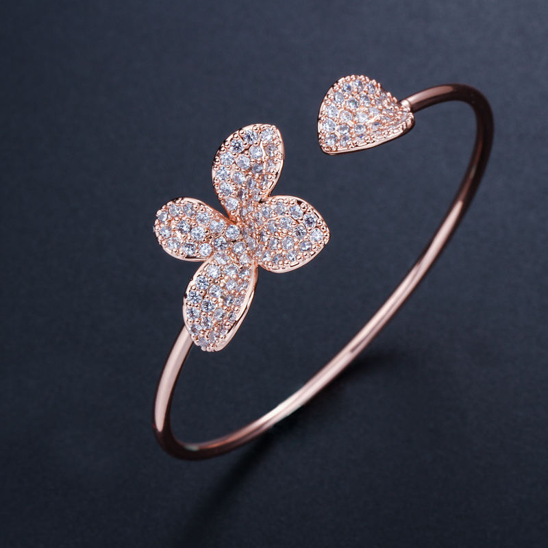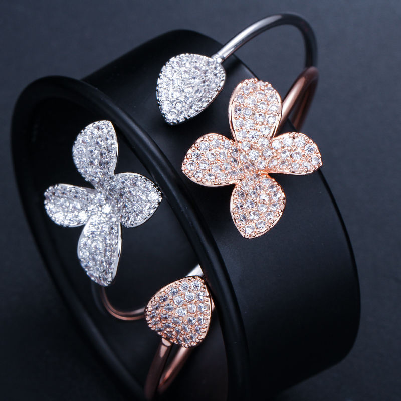 Bracciale a Polsino Aperto Regolabile alla Moda in Ottone Argento e Oro Rosa con Zirconi e Fiori, Gioiello da Donna, Idea Regalo
