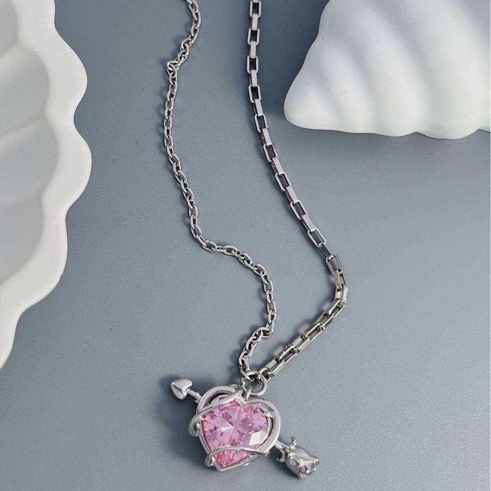 Trendy Copper Sweet Pink Zircon Cupid Heart Pendant Necklace with Link Chain One Arrow Piercing