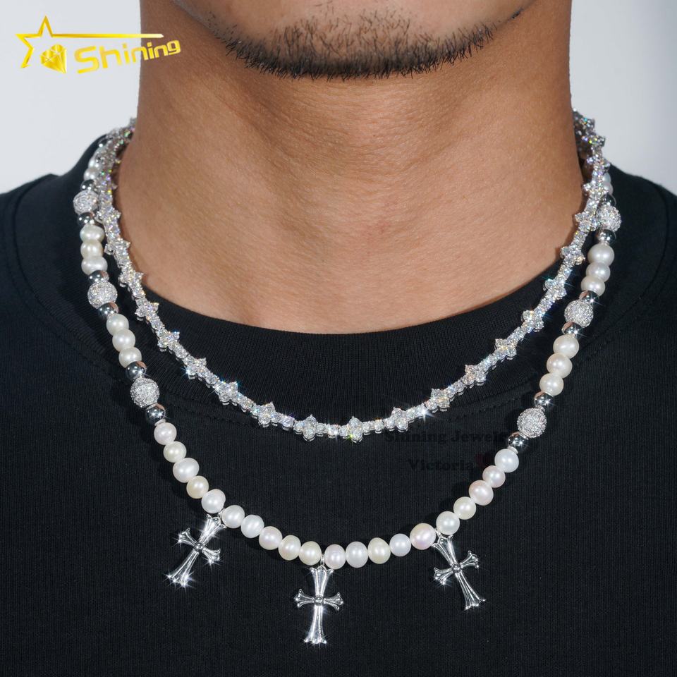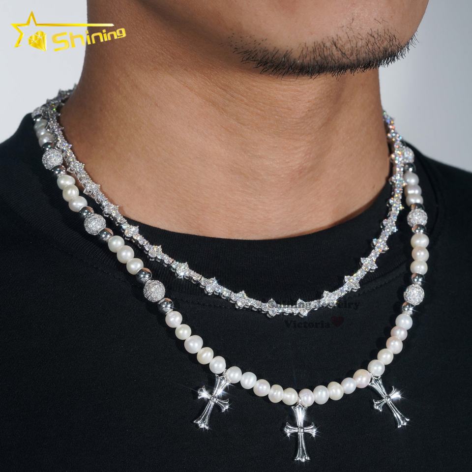 Collana Trendy con Ciondolo a Croce in Argento Sterling 925, Diamante Moissanite VVS, Catena Tennis 3MM e Perla Rosario 8MM