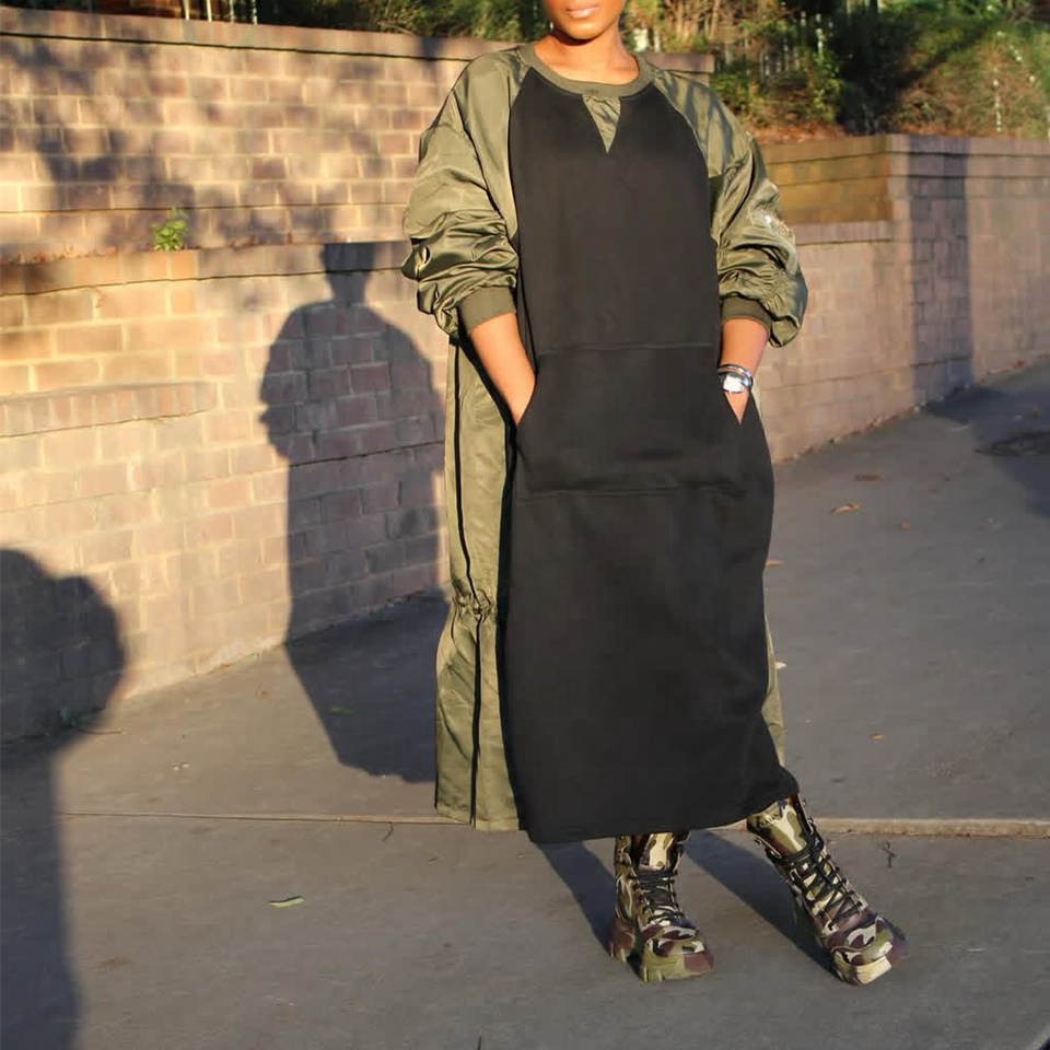 Trendy Fashion Fall Winter Women Ladies Long Sleeve Contrast Color Blocking Loose Long Maxi Straight Dress Casual Women Dress