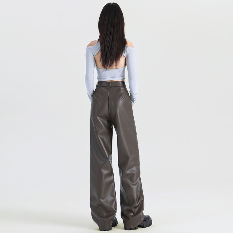 Trendy High-Waisted Maillard Leather Pants for Women Slimming Loose Wide Leg Casual PU Fabric Hot Girl Floor-Length Straight