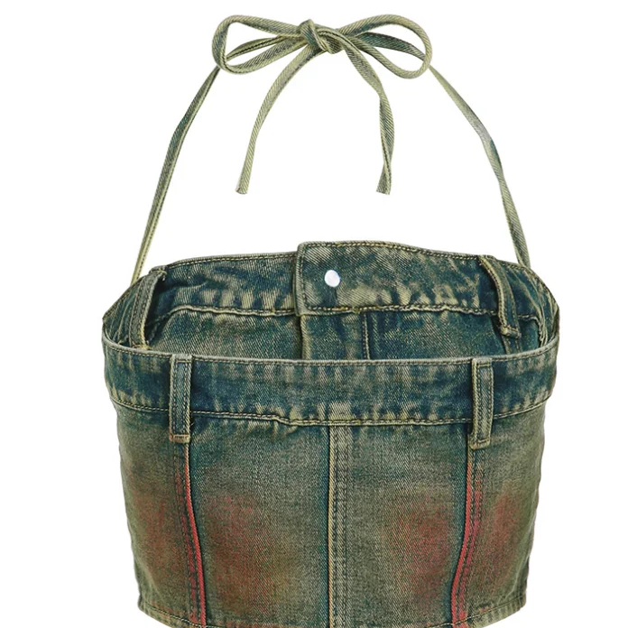 Set Trendy Vintage 2 Pezzi in Denim: Top Corto e Gonna, Casual, da Festa, Sexy, Carino, Senza Spalline, con Strass, Effetto Stonewashed, Skinny, Stile Y2K, Estivo, 100% Denim