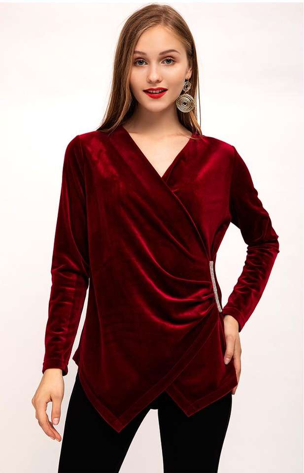 Camicetta alla moda in velluto Vintage con scollo a V per donna Design marrone personalizzato con paillettes autunno/primavera a maniche lunghe anteriore per il commercio all'ingrosso
