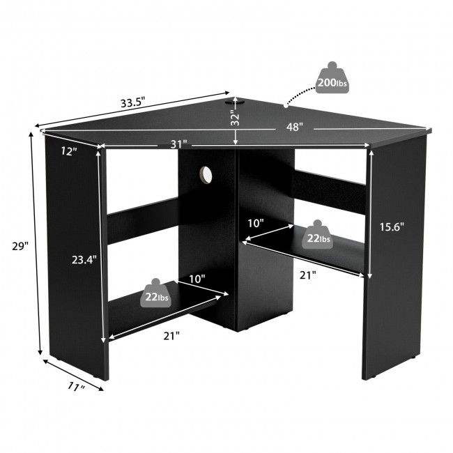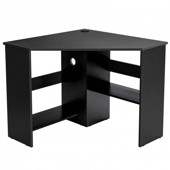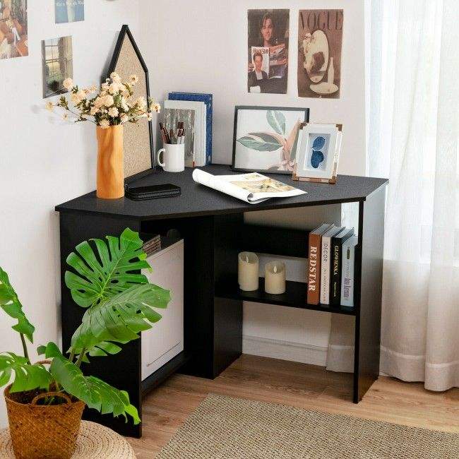 Scrivania ad angolo triangolare con ripiano portaoggetti e postazione di lavoro