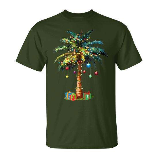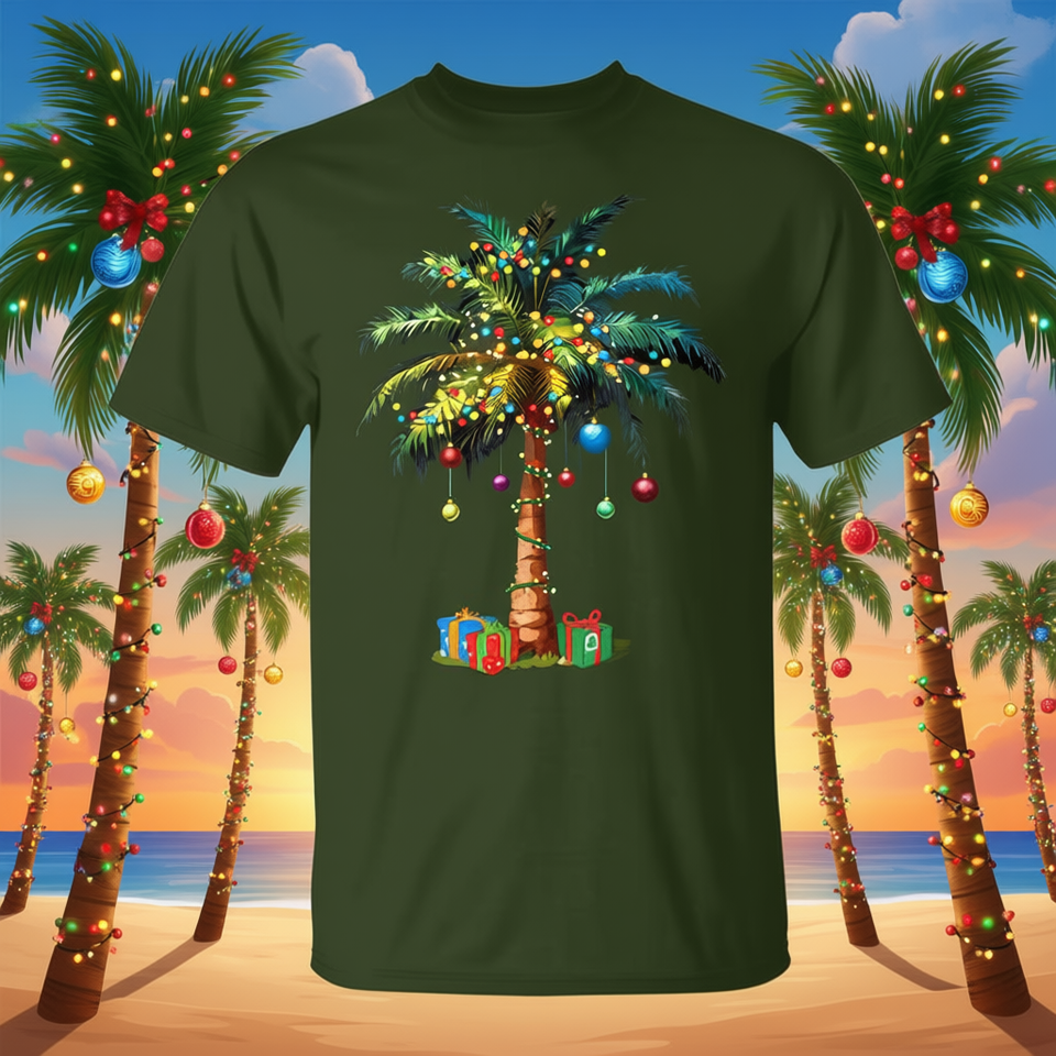 T-shirt con palma natalizia tropicale, luci e decorazioni per le feste