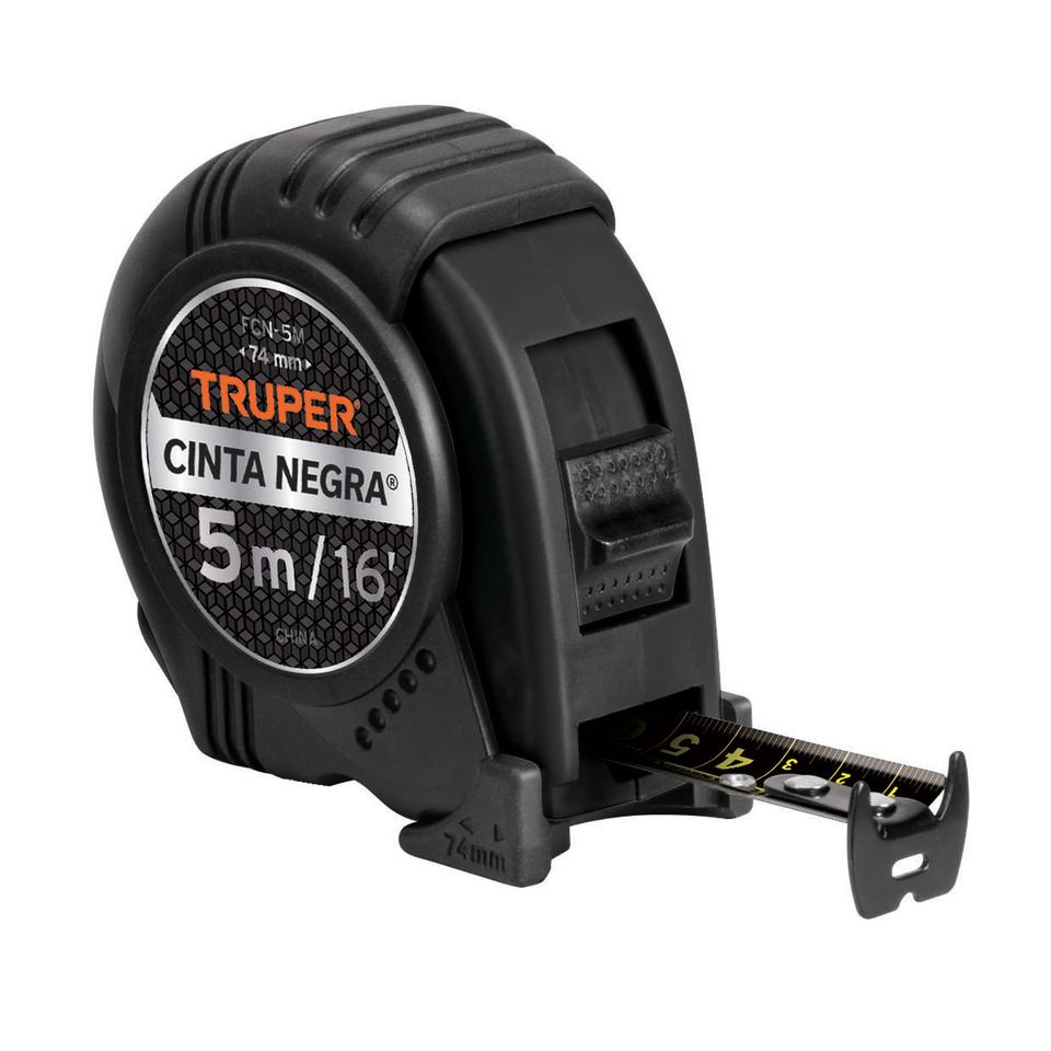 Truper Cinta Negra 5M Self-Winding Tape Measure, 19mm Steel Blade, Automatic Return, Push-Button Lock, High-Visibility Black Bla