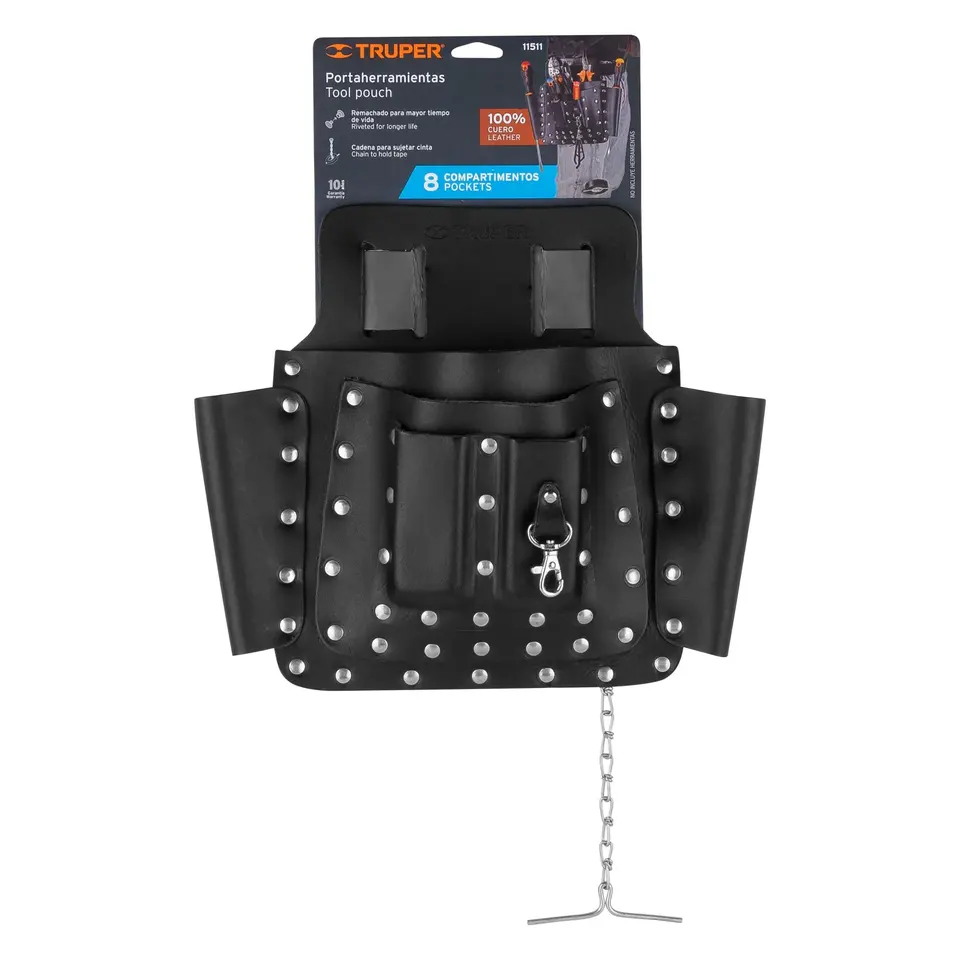 Truper Leather Tool Bag with 8 Compartments Electrician Style for Tool Storage Includes Nylon and Wood Material
