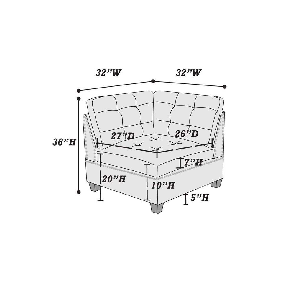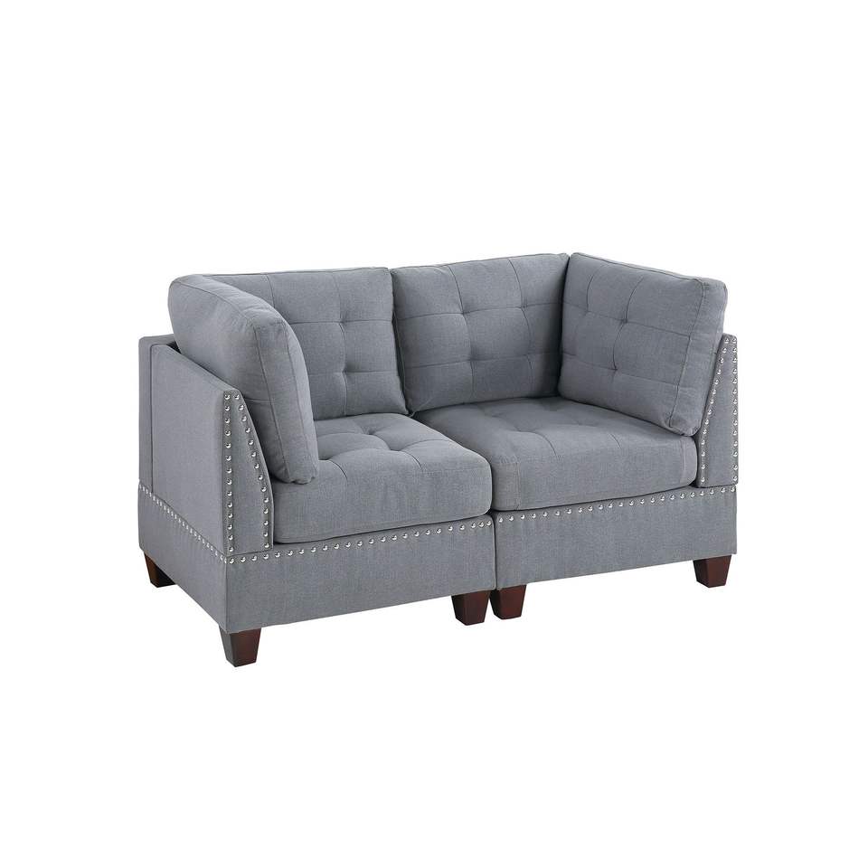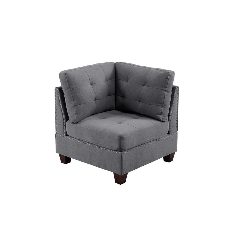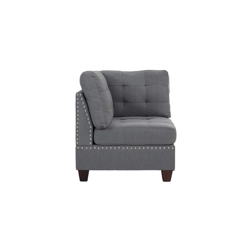 Divano Angolare Tufted 1 Pezzo in Tessuto Grigio Effetto Lino con Borchie e Gambe in Legno per Soggiorno