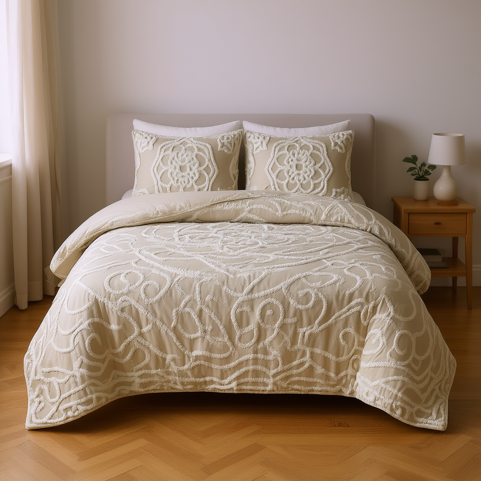 Set Copripiumino Trapuntato in Cotone 3 Pezzi con Motivo Geometrico Stile Classico per Arredamento Casa