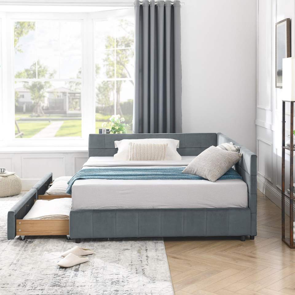 Letto contenitore matrimoniale trapuntato con schienale e braccioli confortevoli, divano letto imbottito per camera da letto