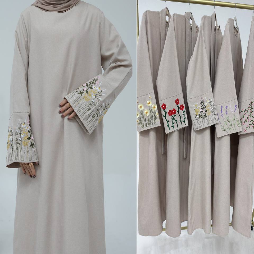 Abaya Elegante per Donne Musulmane Serie Ricamo Floreale Medio Oriente Dubai in Poliestere Traspirante Manica Lunga Casual