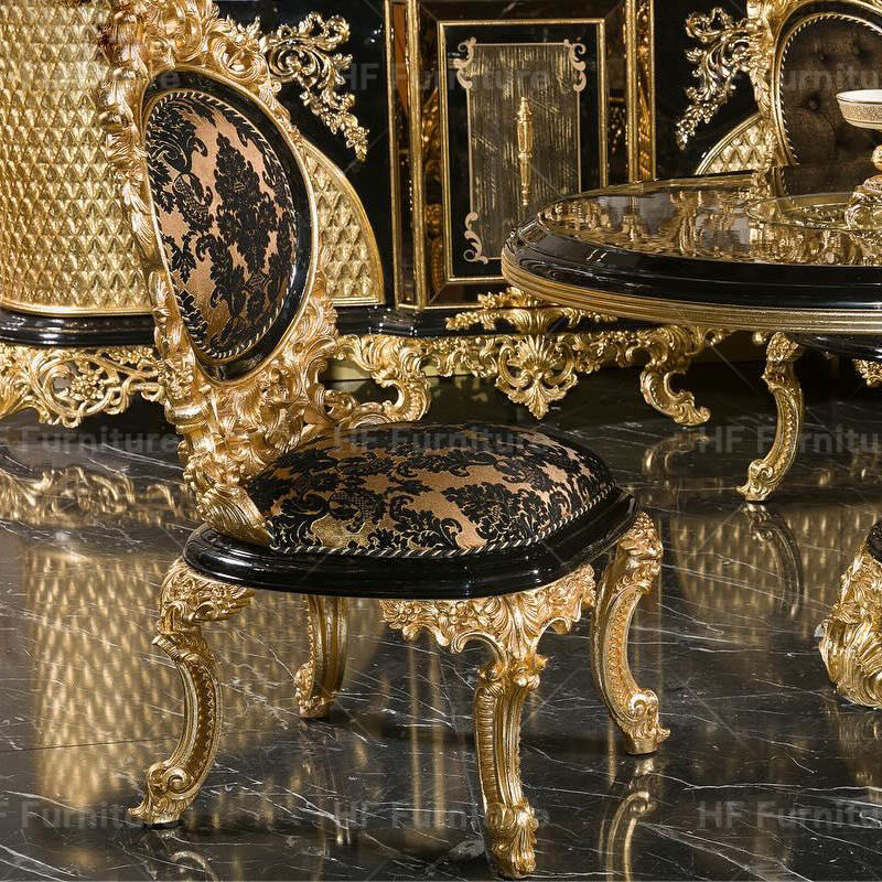 Set Tavolo da Pranzo Turco Barocco Reale Intagliato a Mano con 8 Sedie, Nero e Oro, Arredamento per Sala da Pranzo