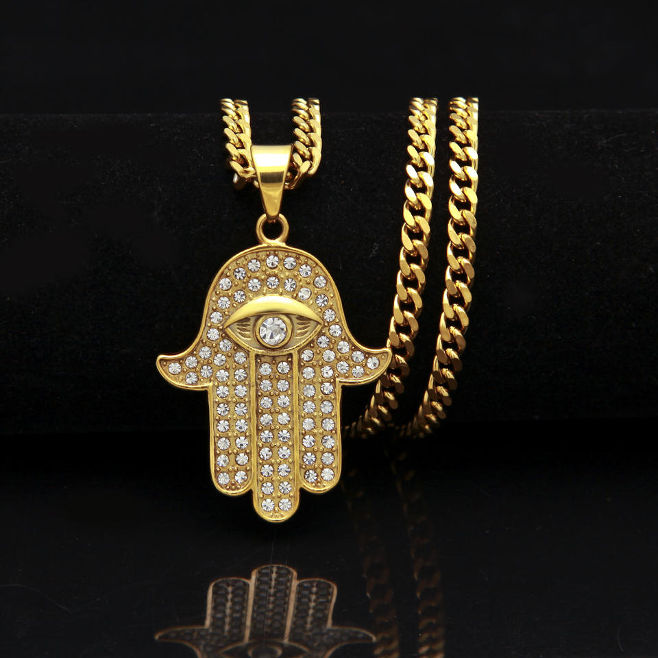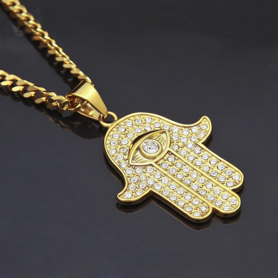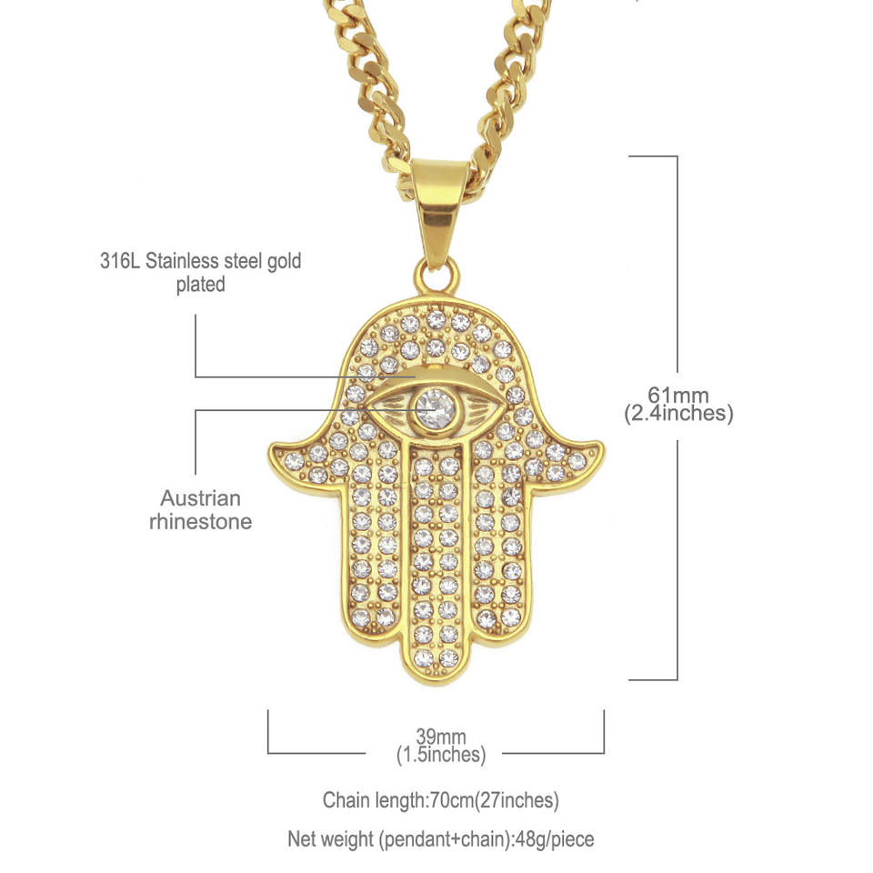 Turco Dell'occhio diabolico della Mano di Hamsa di Fatima Pendente Della Collana In Oro In Acciaio Inox Ghiacciato Fuori Il Pendente e Catena di Hip Hop Delle Donne/Degli uomini Dei Monili