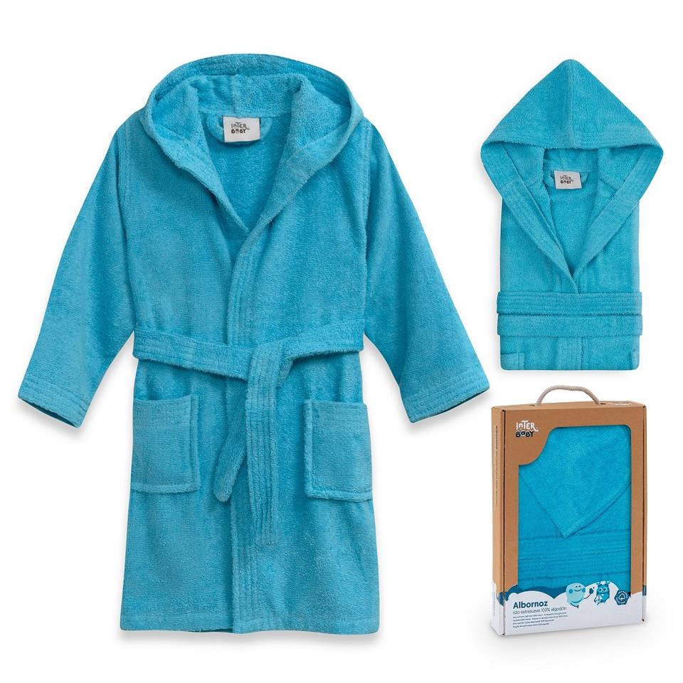 Accappatoio turchese per bambino, taglia S (6-8 anni), tinta unita, in spugna, per uso in bagno, confezionato in scatola regalo.