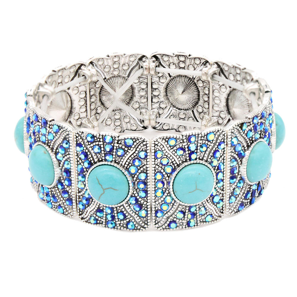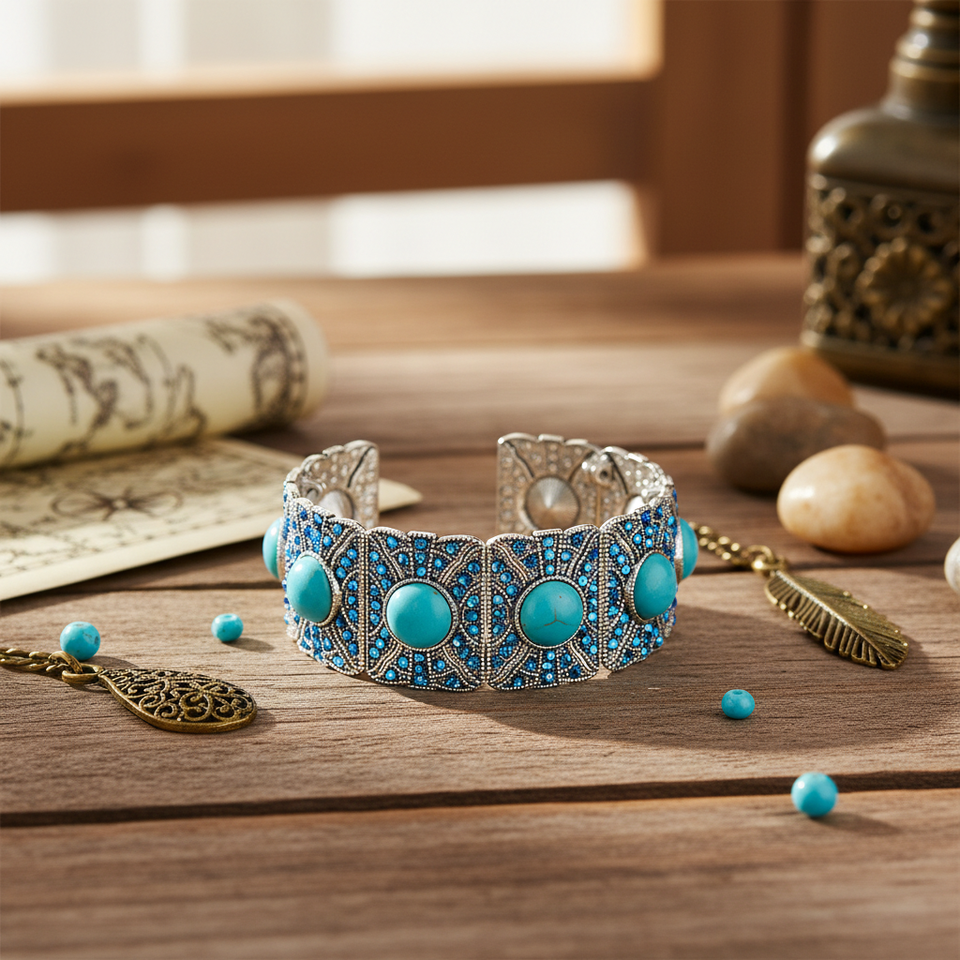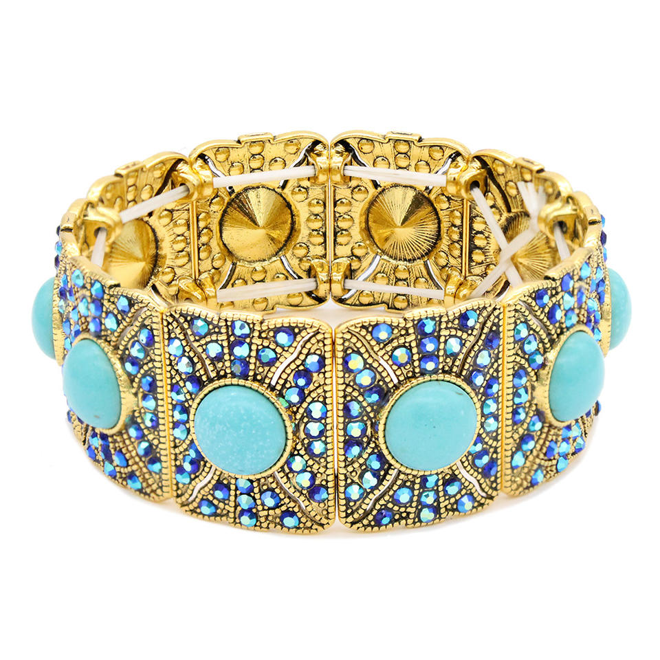 Turquoise Stone Beaded Bracelet with Anti-Gold Plating Bohemian Style Religious Stainless Steel Bangles