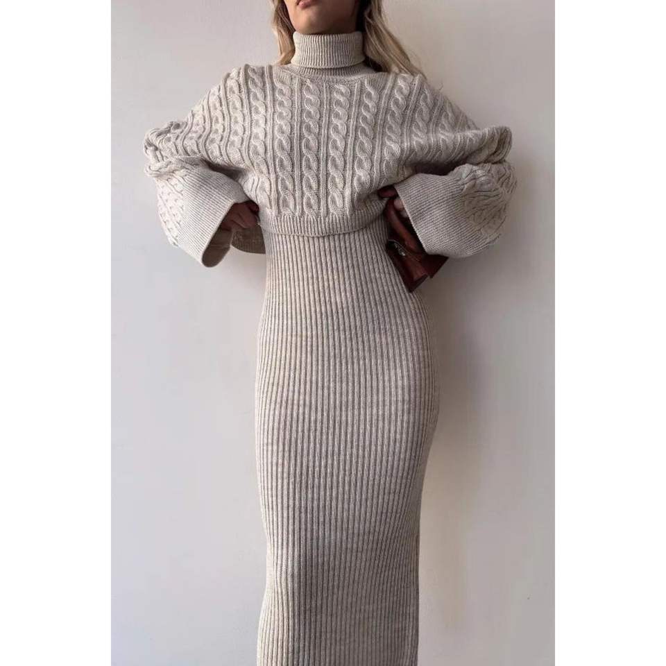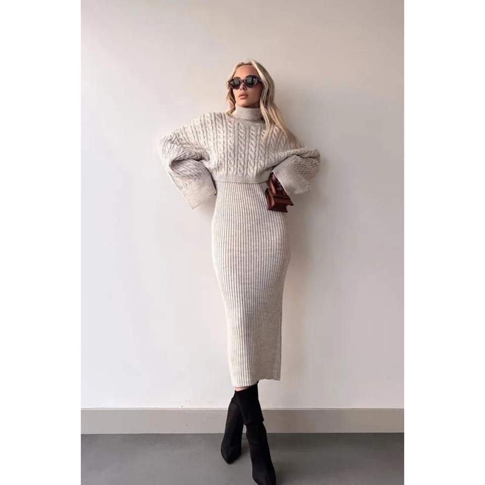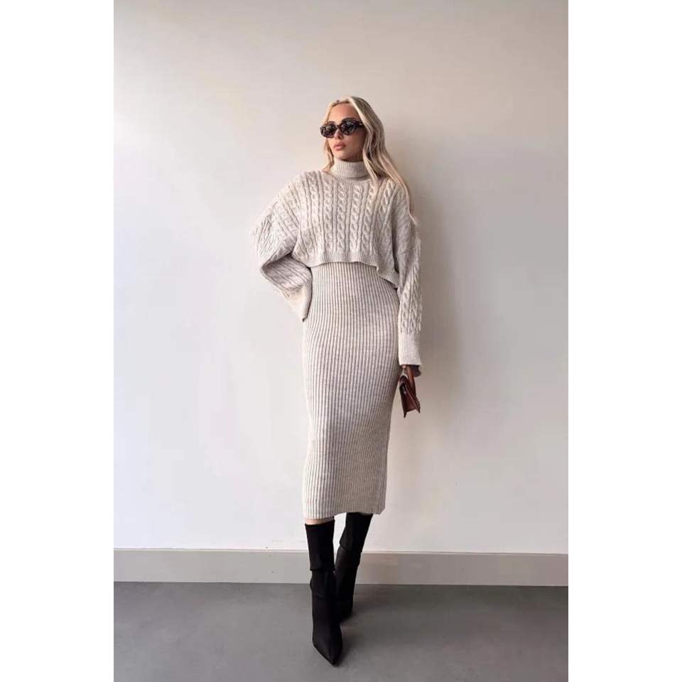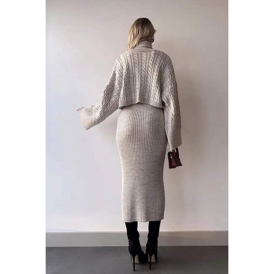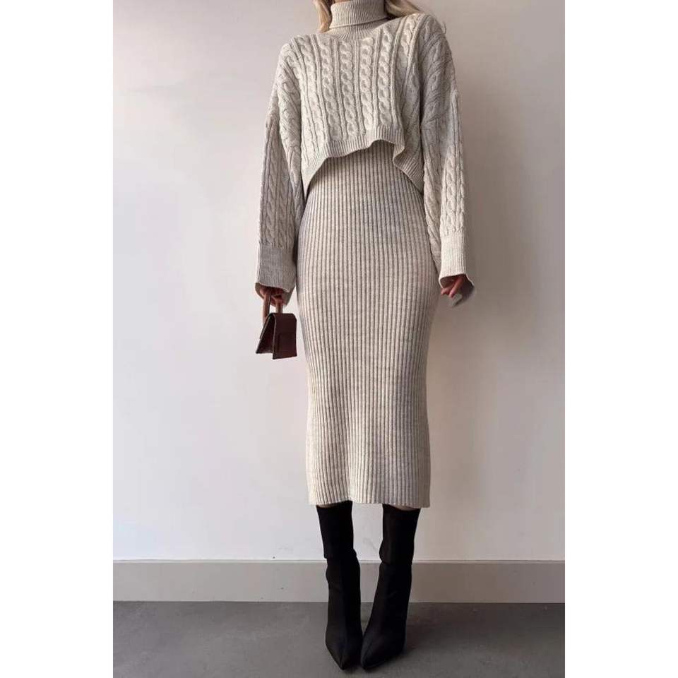 Turtleneck Knitted Motif Crop Sweater and Knitwear Dress Set Standard Size