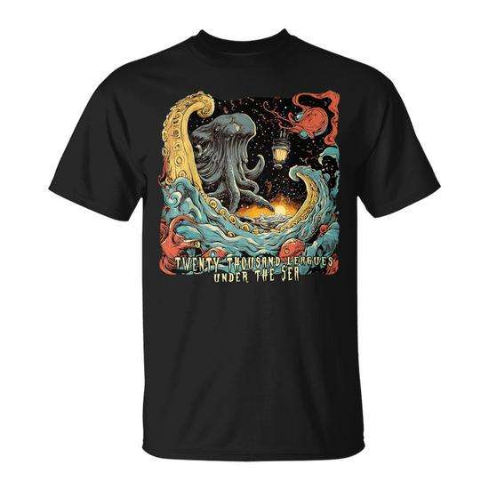 Twenty Thousand Leagues Under the Sea T-shirt unisex per adulti, nera, girocollo, a maniche corte, con stampa serigrafica e design grafico