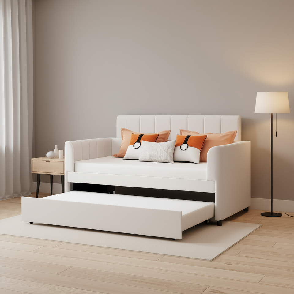 Divano letto matrimoniale imbottito beige con letto estraibile, design moderno
