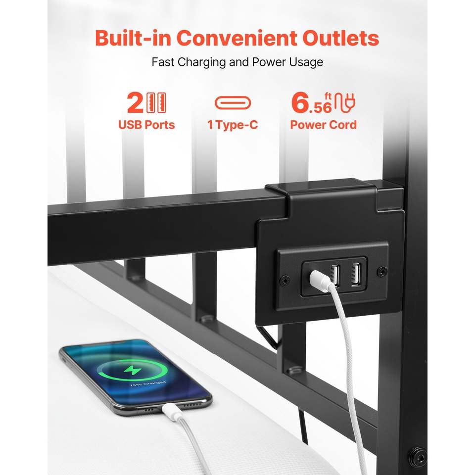 Letto a giorno matrimoniale in metallo con luci LED, ricarica USB, altezza regolabile e letto estraibile, piattaforma robusta
