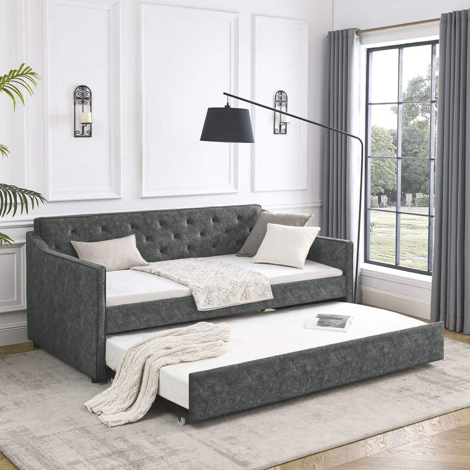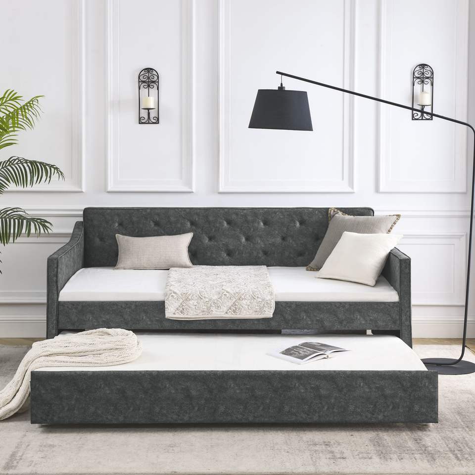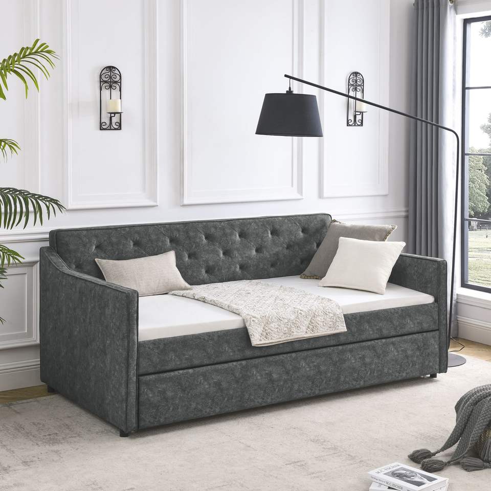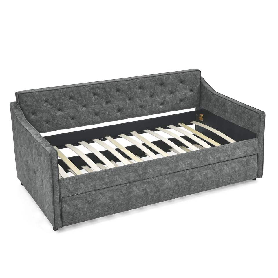 Twin Size Tufted Sofa Bed with Trundle Upholstered Grey Daybed Waved Arms Dimensions 80.5"x44.5"x33.5"