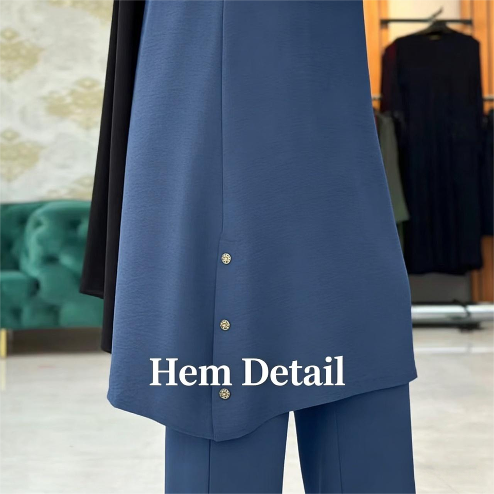 Completo Due Pezzi Estivo Elegante Taglie Forti Abaya Tunica e Pantaloni con Collo, Maniche Lunghe, Bottoni in Legno e Cuciture Laterali Elastiche per Donne Musulmane