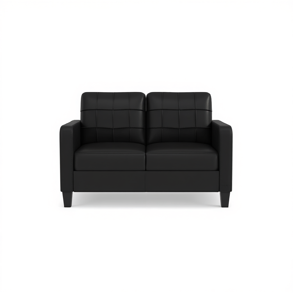 Divano a due posti in similpelle nera con schienale trapuntato e gambe in metallo per soggiorno dal design moderno